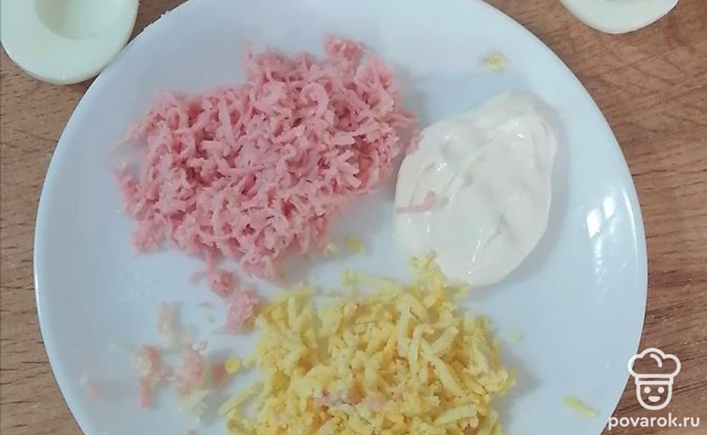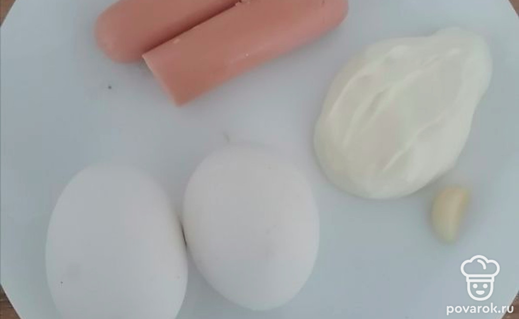 Разрежьте яйца вдоль так, чтобы белок остался с ровными краями. Выньте желток и используйте его в начинке. Сосиску, чеснок и желток натрите на мелкой терке, смешайте со сметаной.