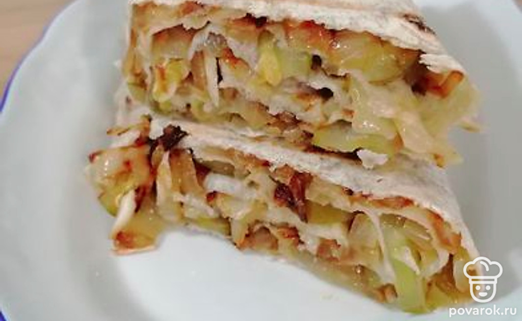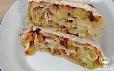 Заверните лаваш по бокам. Затем плотно сверните в трубочку.
