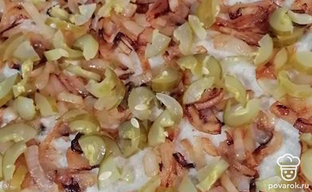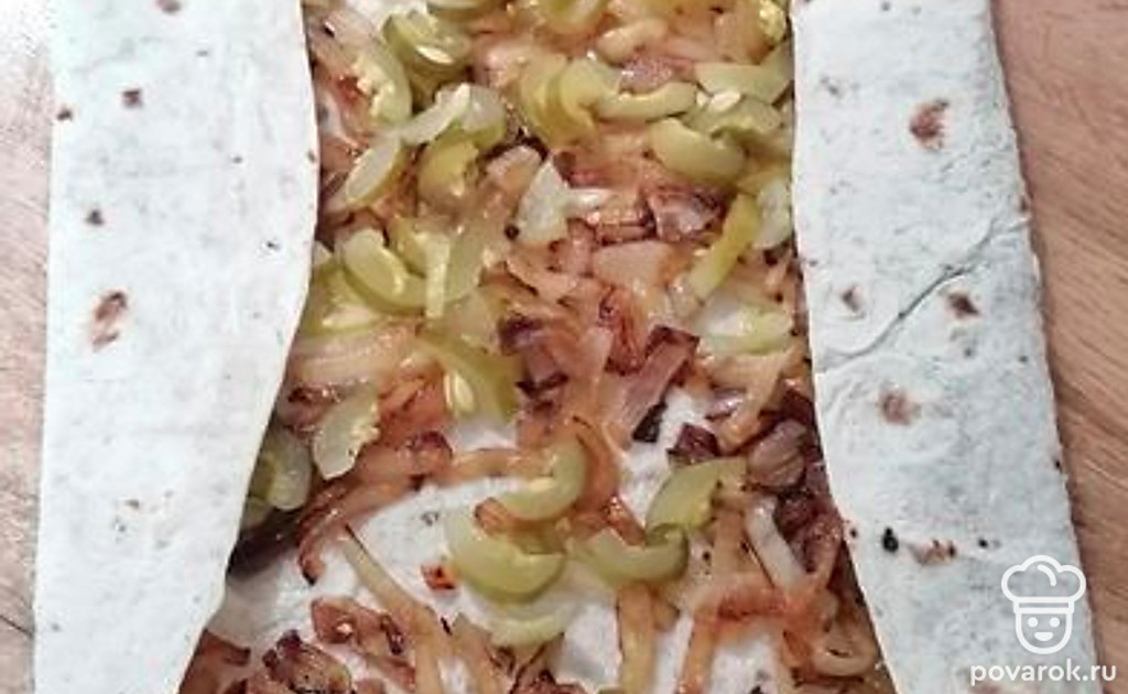 На лист лаваша равномерно выложите лук. Сверху положите огурцы.