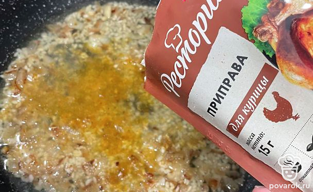 Добавьте приправу для птицы. Все снова перемешайте, закройте крышкой и томите 20 минут на медленном огне, периодически помешивая.