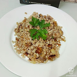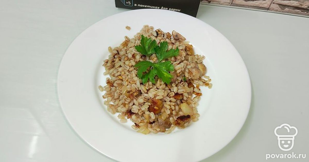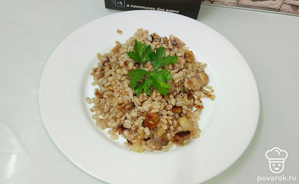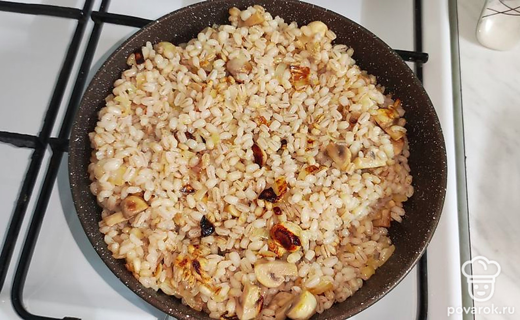 После того, как перловка сварилась, смешайте ее с грибами и луком. Обжарьте на среднем огне, для получения аппетитной корочки.