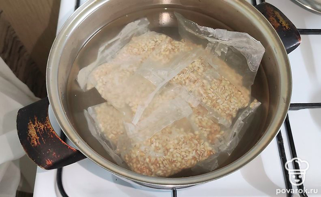 Отварите перловку в пакетиках от компании «Global Village» согласно инструкции на упаковке. Пакетики залейте водой, доведите до кипения. Посолите и на среднем огне варите 50 минут.