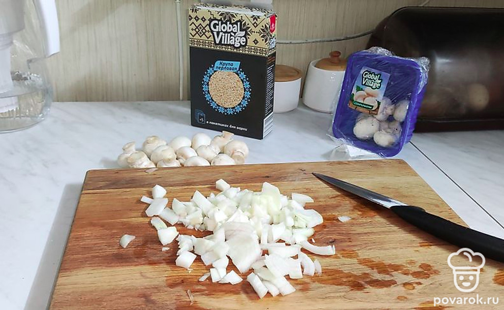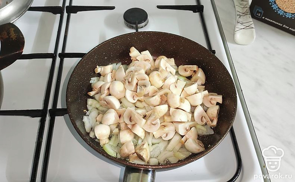 Шампиньоны нашинкуйте крупными кусочками. На растительном масле обжарьте репчатый лук и шампиньоны, посолите по вкусу.