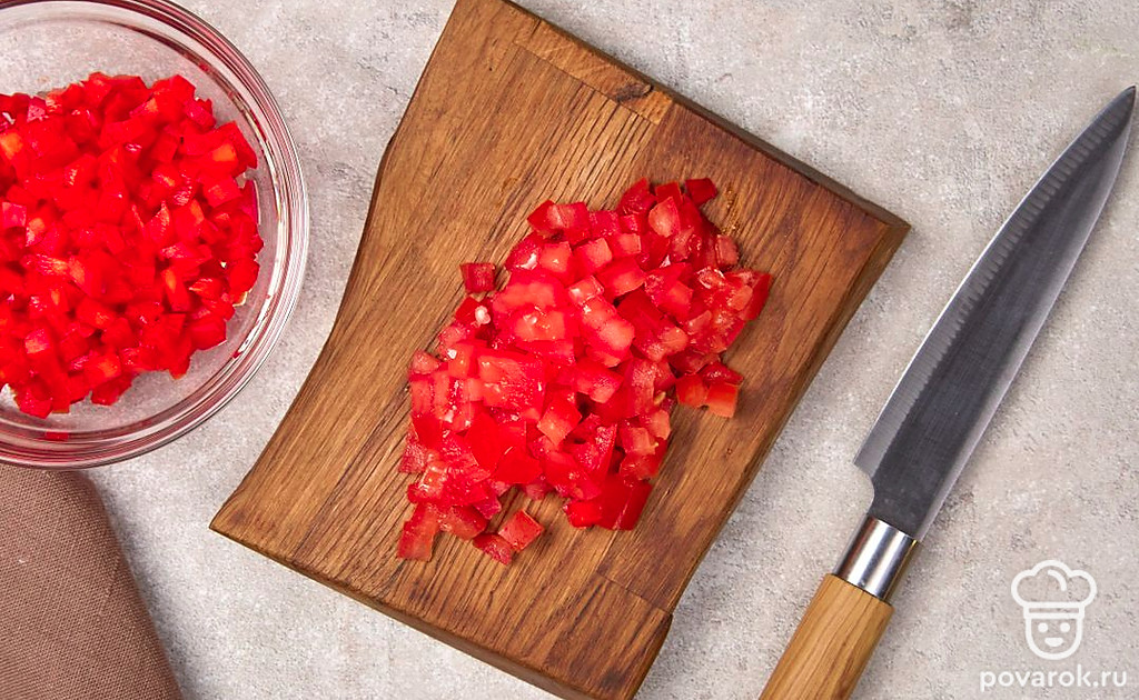 Измельчите болгарский перец и помидор кубиками такого же размера, как и лук.