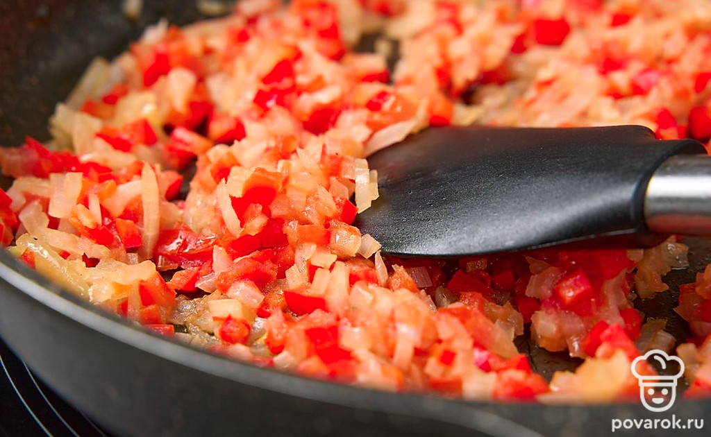 Выложите в сковороду овощи и обжарьте их в течение 7-8 минут, периодически помешивая. Снимите сковороду с огня.