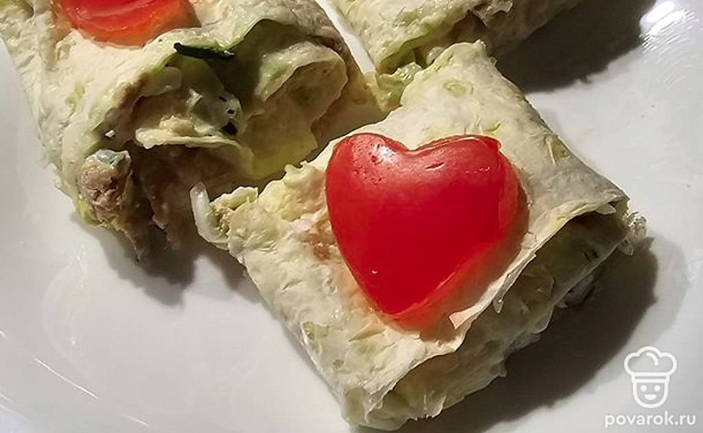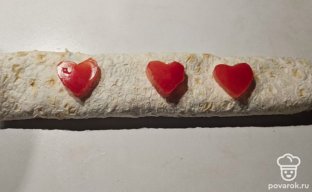 Сверните в рулет и поставьте в холодильник на 2 часа, вырежьте из помидора сердечки и украсьте.