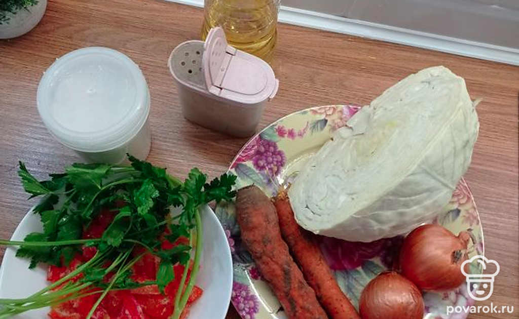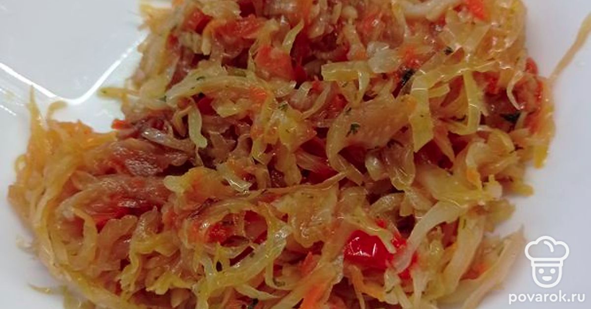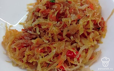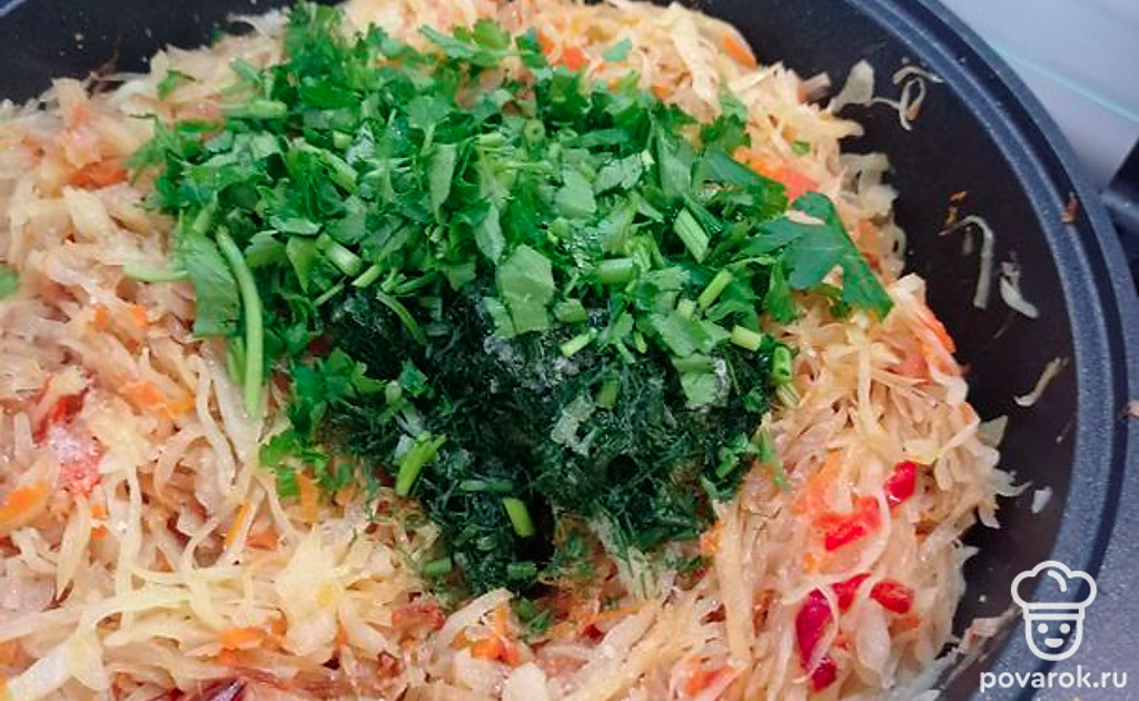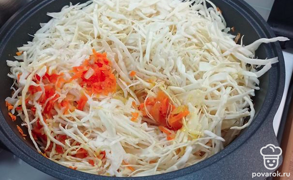 К обжаренным овощам, добавляем капусту, перемешиваем, тушим до готовности.