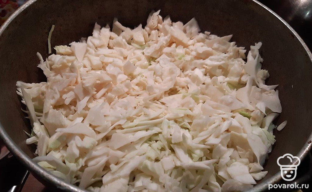 Капусту нашинковать, обжарить на растительном масле в казане 20 минут.