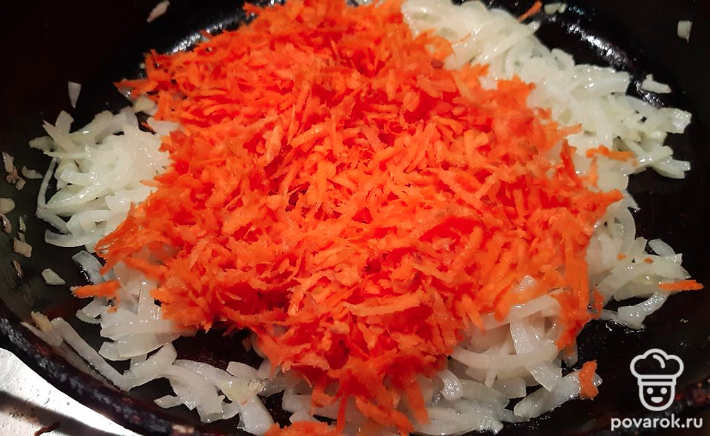 Морковь натереть на терке, лук нарезать, обжарить на сковороде.