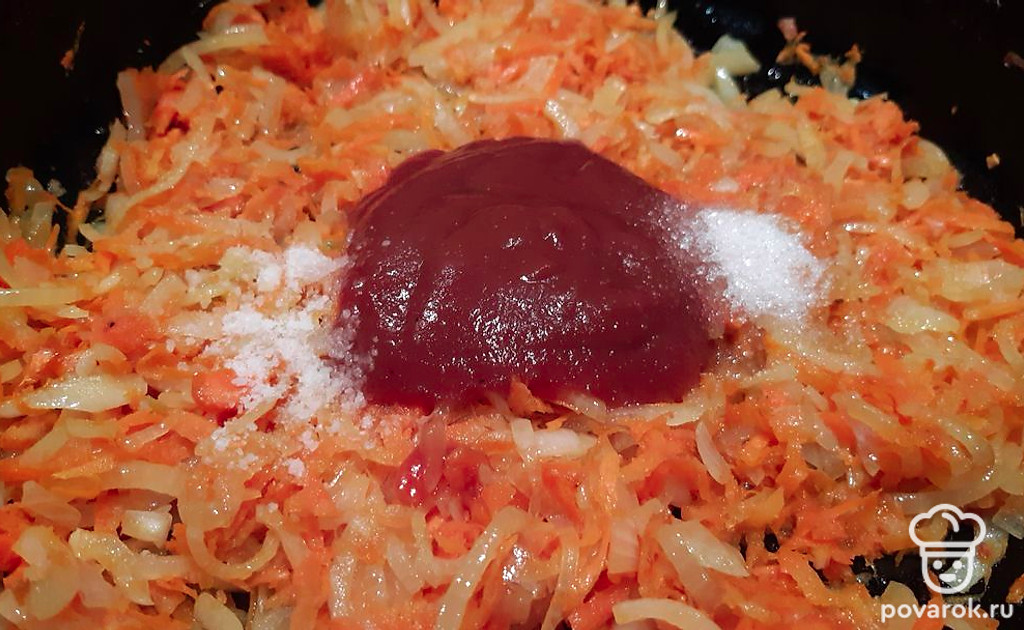 Добавить томатную пасту, соль, сахар, перец, специи.
