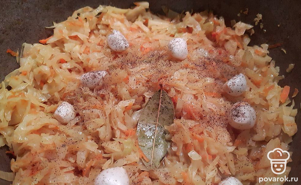 Соединить обжарку с капустой, добавить чеснок, тушить еще 5 минут.