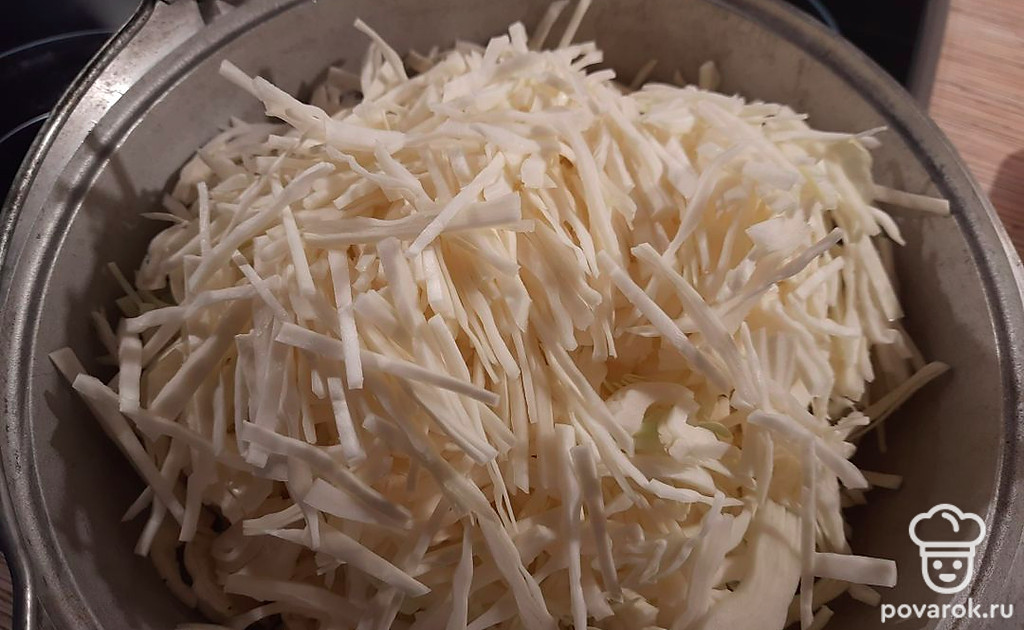 Капусту нашинковать и поставить на медленный огонь. Я тушу в казане в течение 1,5 часов, периодически перемешивая.
