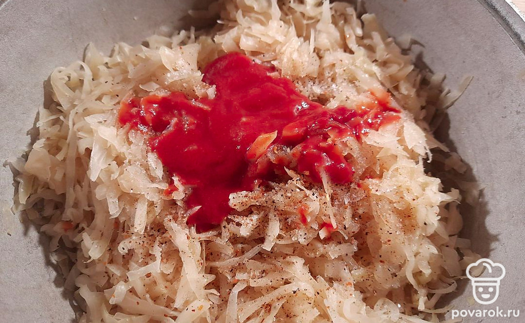 Когда капуста станет мягкой, добавить соль, перец, томатную пасту и лук. Тушить 10 минут и снять с огня.