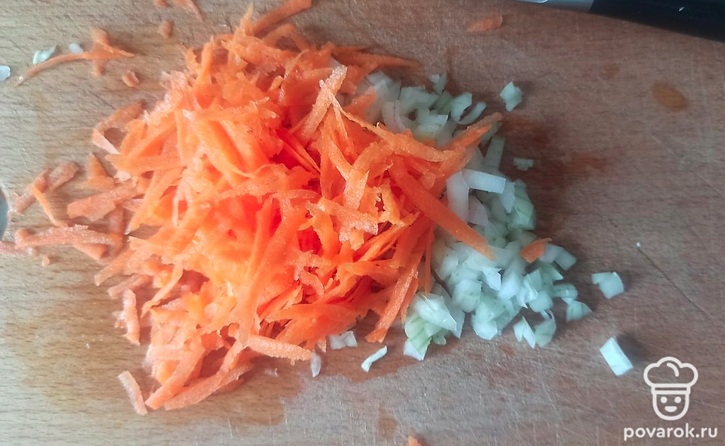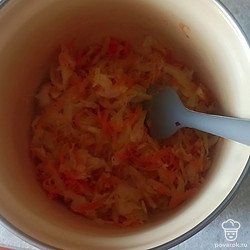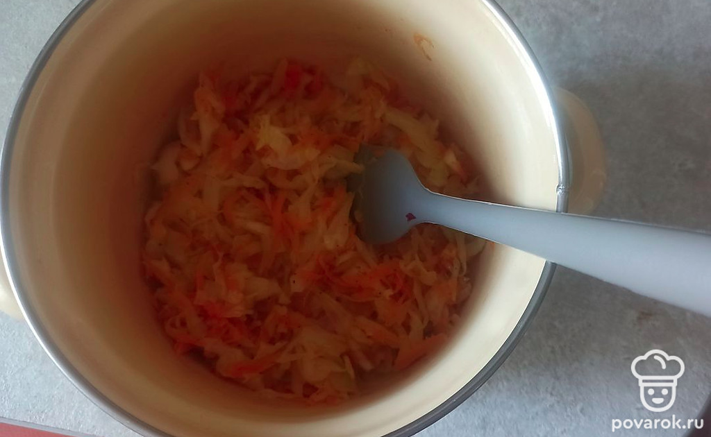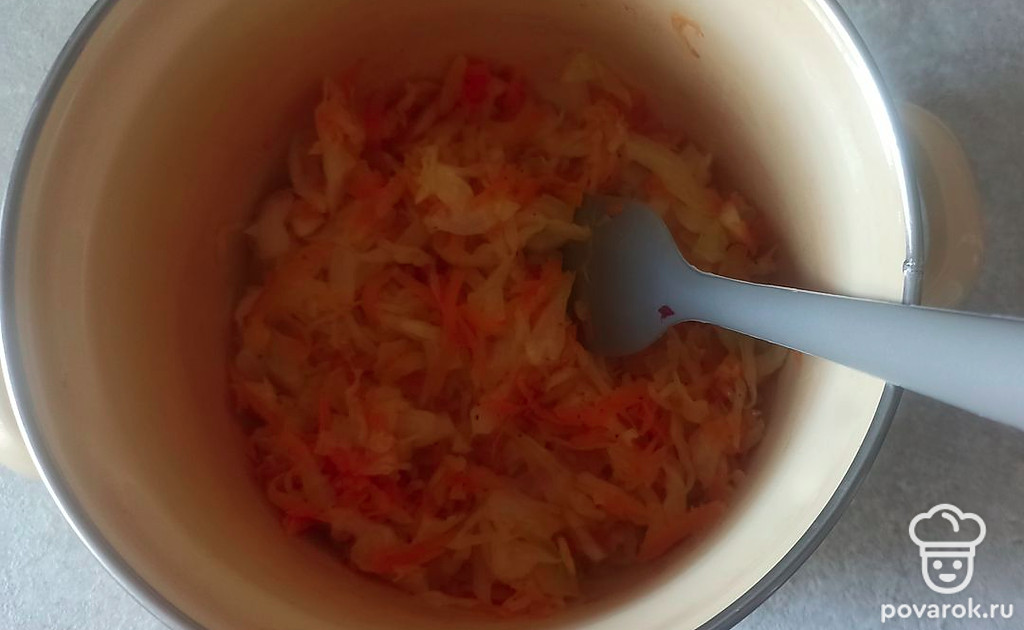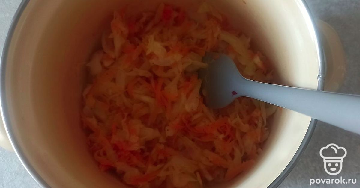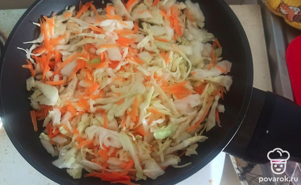 Выложите в сковороду лук, морковь и капусту, поставьте на медленный огонь.