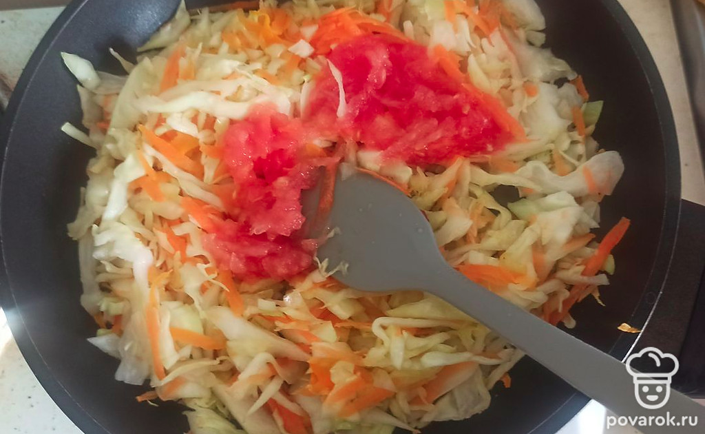 Натрите помидор и добавьте в сковороду, доводим до готовности, в конце солим.
