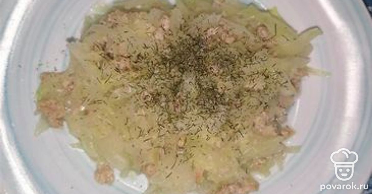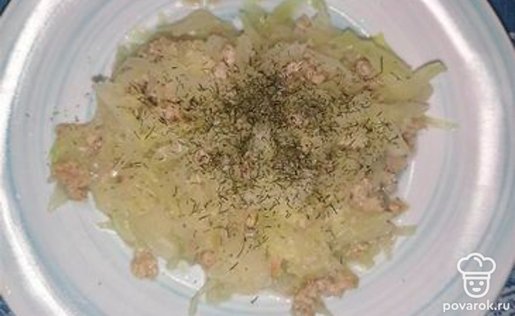 Добавить нашинкованную капусту и залить 300 миллилитров воды.