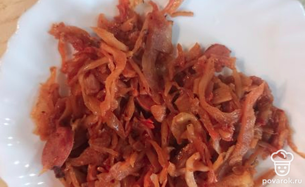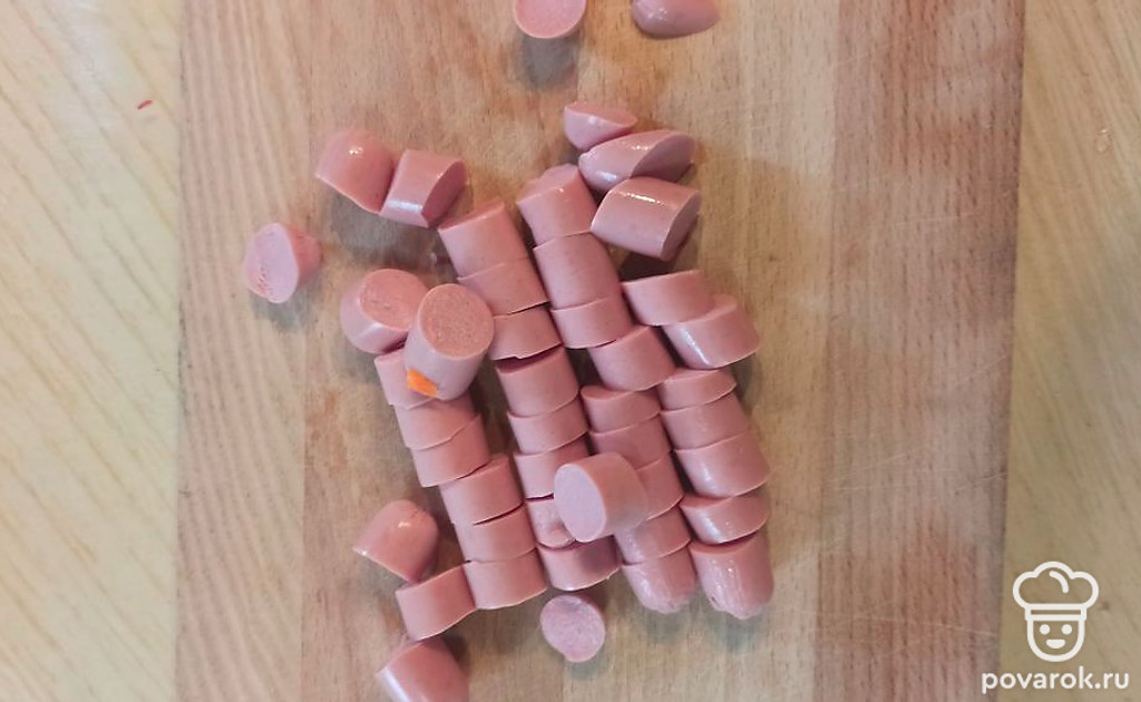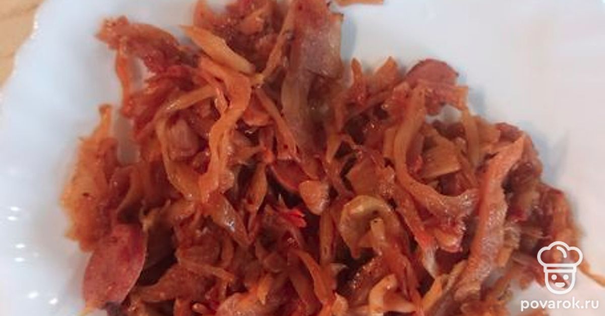 Добавить нашинкованную капусту и нарезанные сосиски.