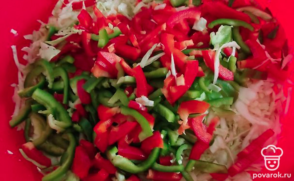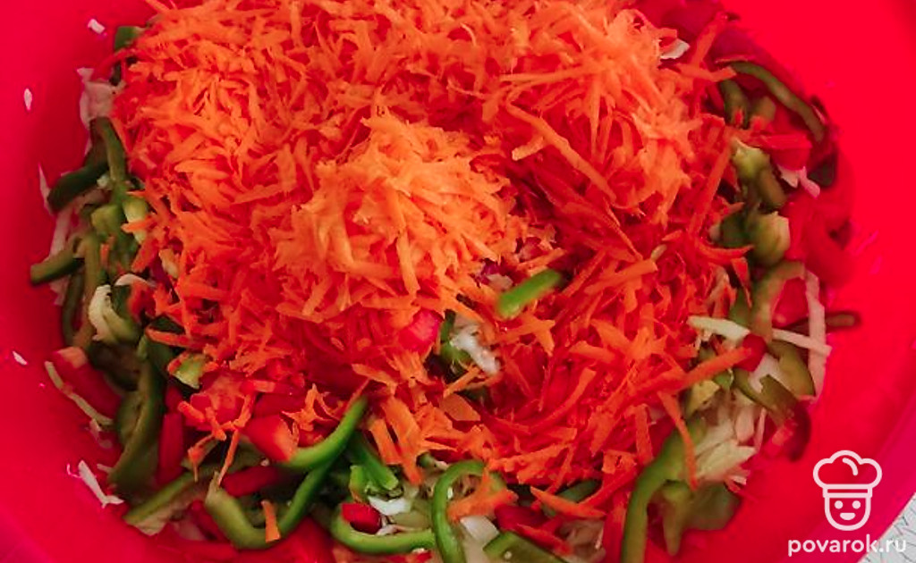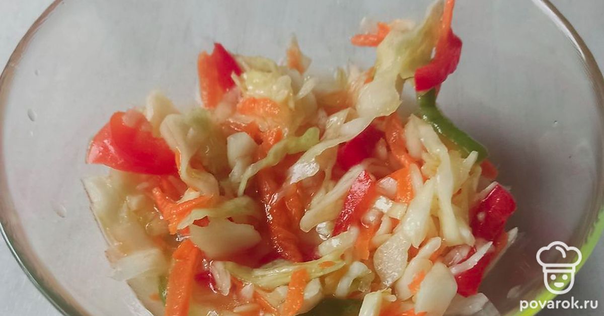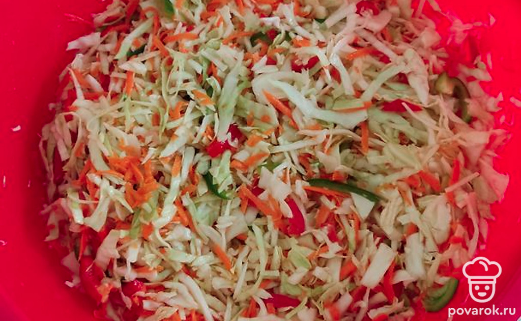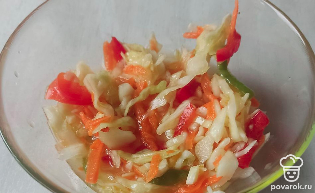 Добавить соль, сахар, растительное масло и уксус. Все перемешать. Оставить мариноваться в емкости на 12 часов при комнатной температуре. Затем переложить в банку и хранить в холодильнике.