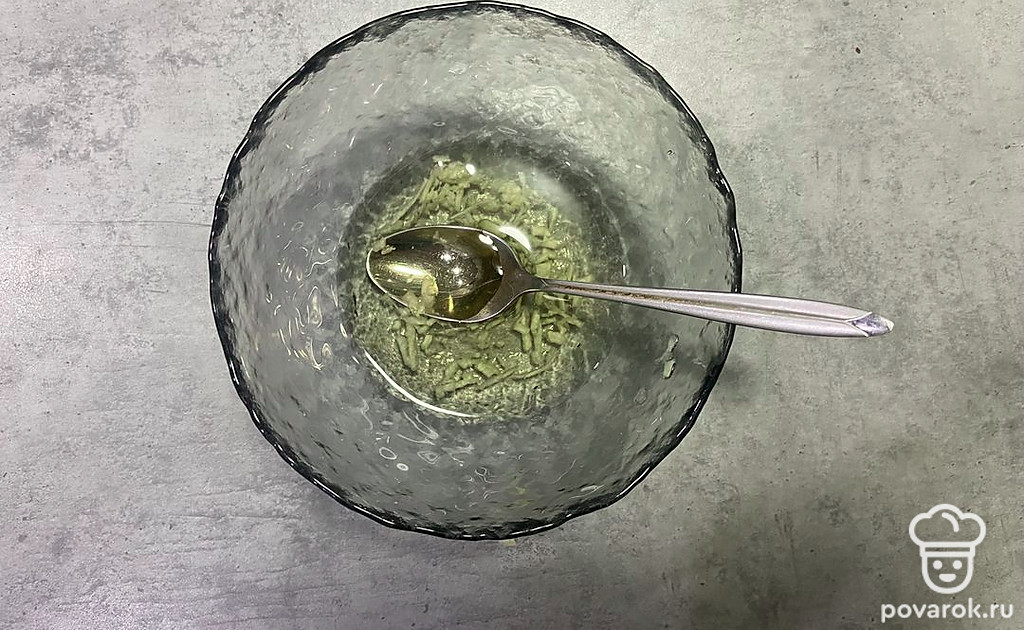 Приготовьте заправку. Для этого в миску налейте подсолнечное масло и натрите чеснок.