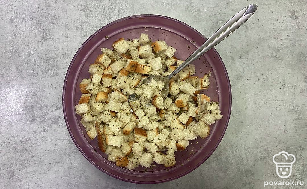 Добавьте полученную заправку в хлеб, тщательно перемешайте.