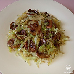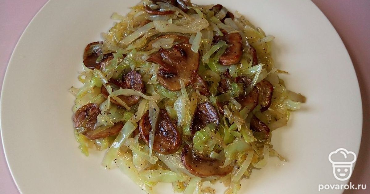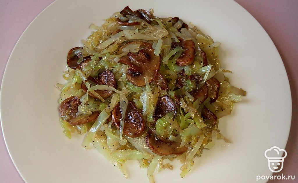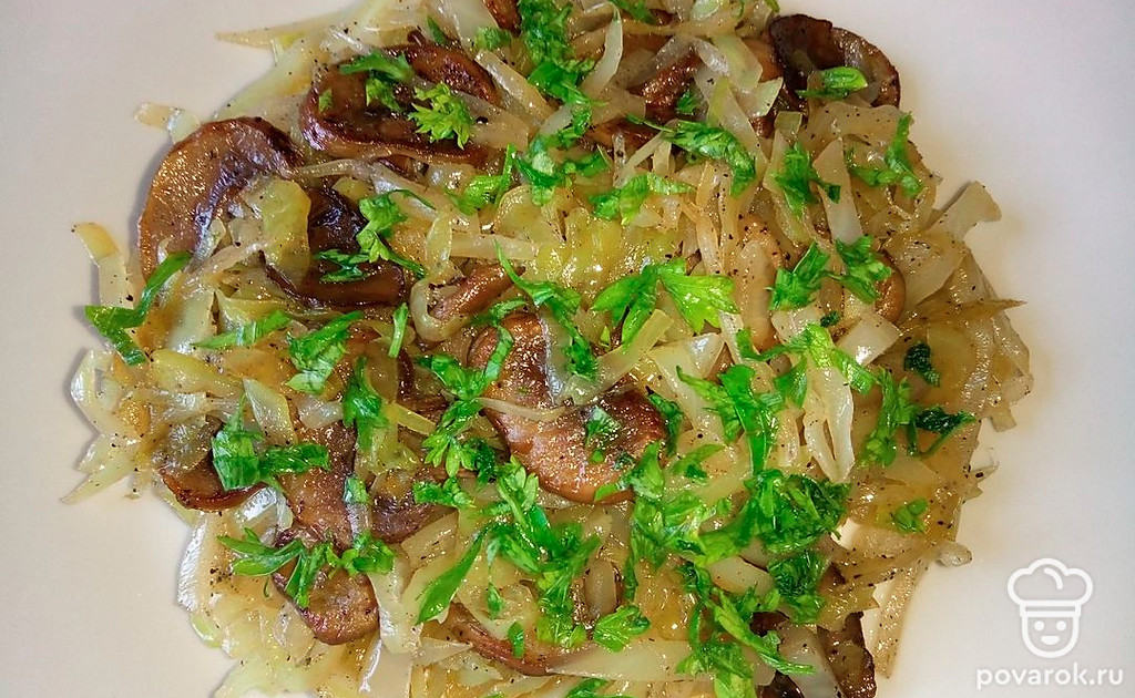 Спустя 10 минут добавьте к капусте нарезанные шампиньоны, перемешайте и тушите вместе до готовности. Если требуется, добавьте соль, а также сушеный чеснок по вкусу. Время от времени не забывайте помешивать.