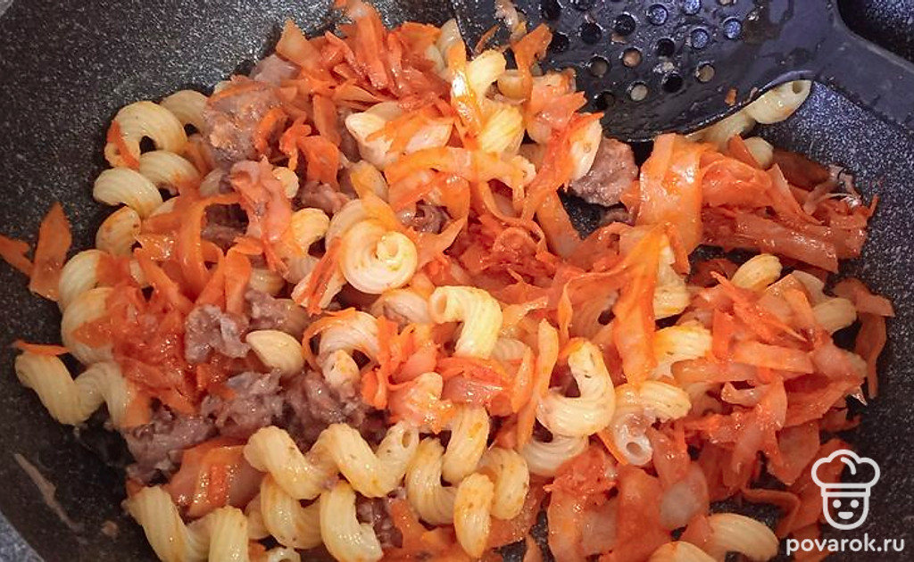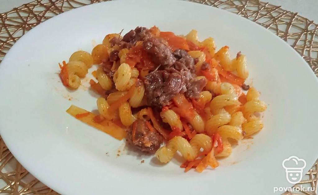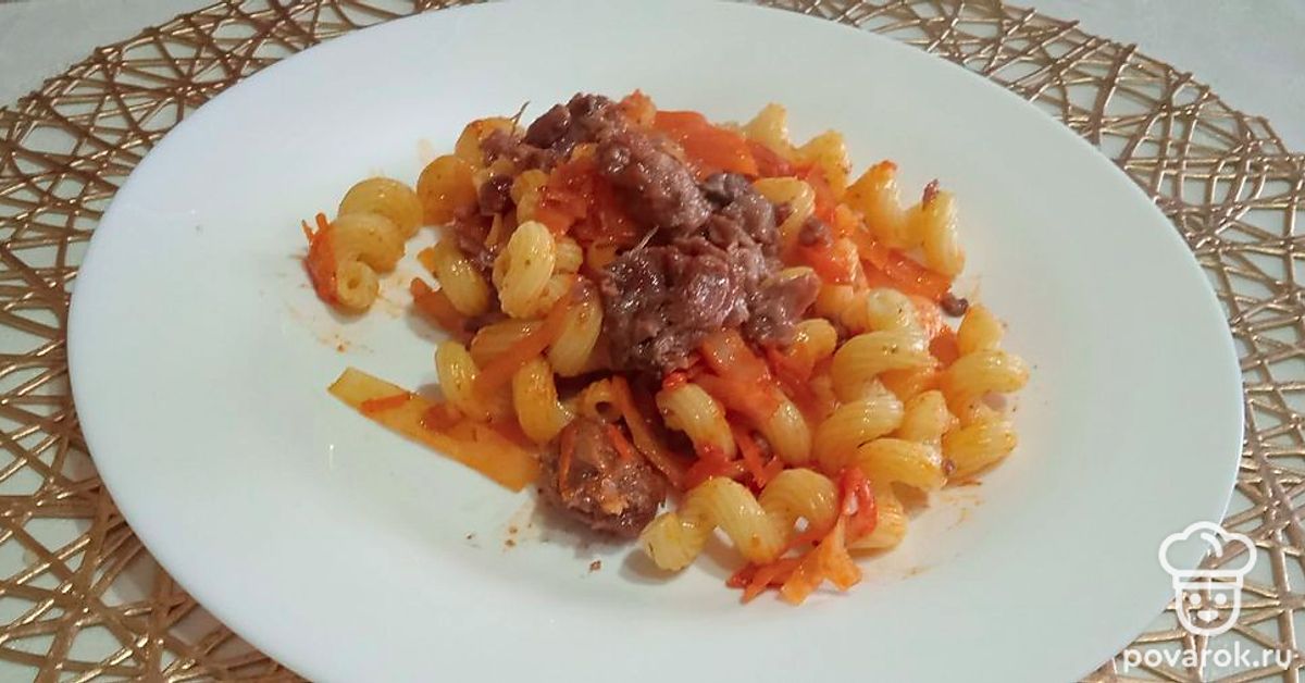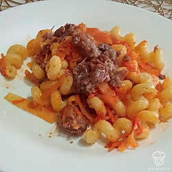 Подготавливаем все ингредиенты. Нам понадобятся макароны, говяжья тушенка, морковь, капуста, масло растительное, соль, сахар, перец, лук.