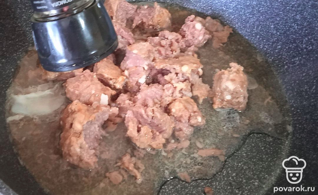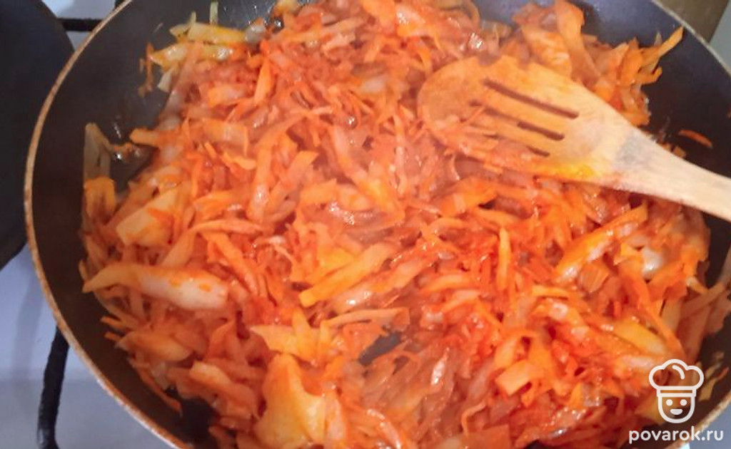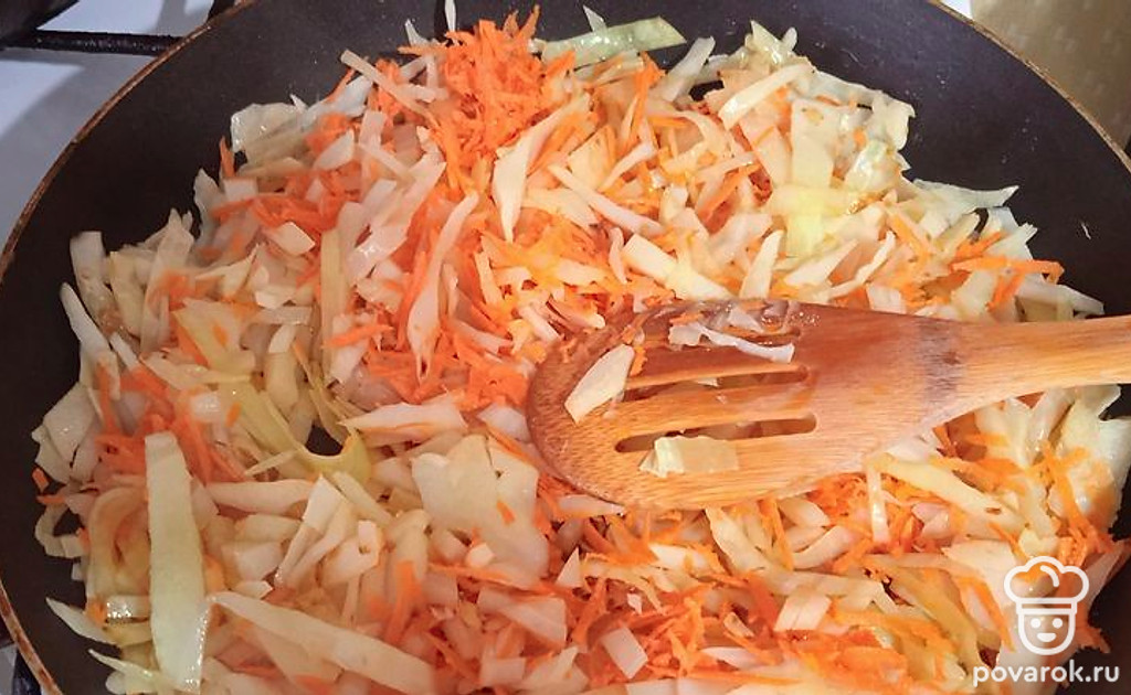 Добавляем к капусте. Солим, перчим, приправляем сахаром.