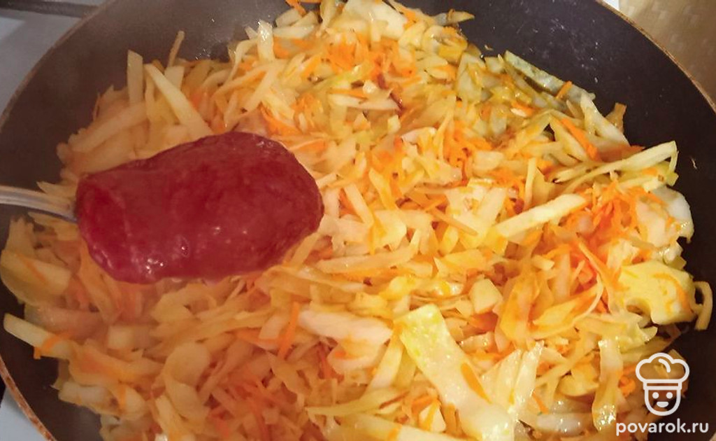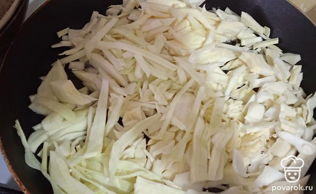 На разогретую сковороду добавляем растительное масло и выкладываем капусту.