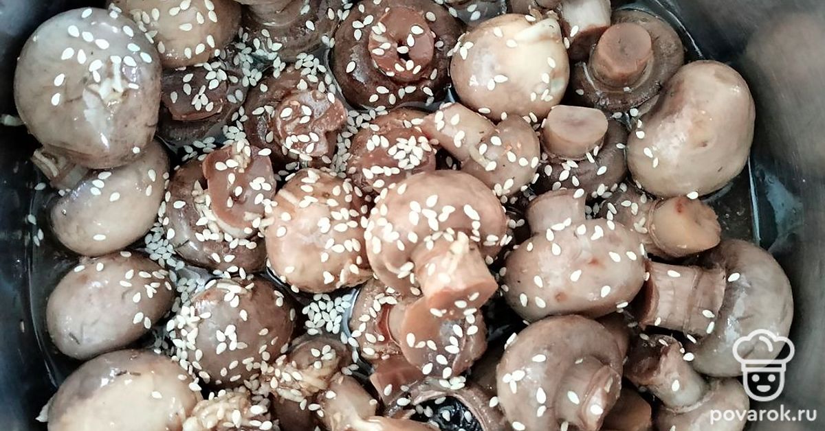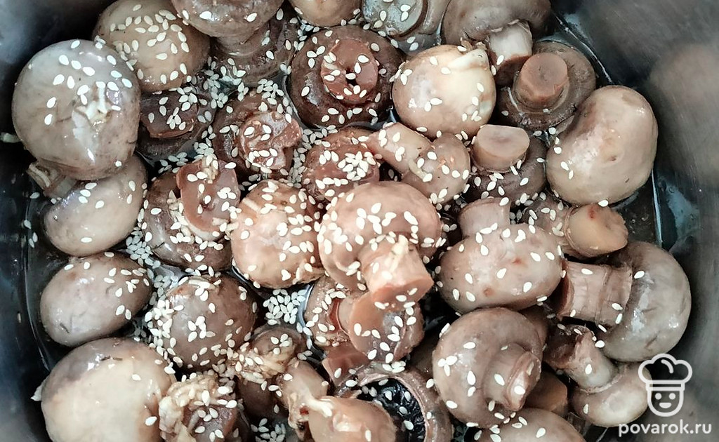 Залейте полученным маринадом вареные грибы. Добавьте подсушенный на сковороде кунжут.  Все тщательно перемешайте. Накройте грибы крышкой и отправьте в холодник на 10 часов.