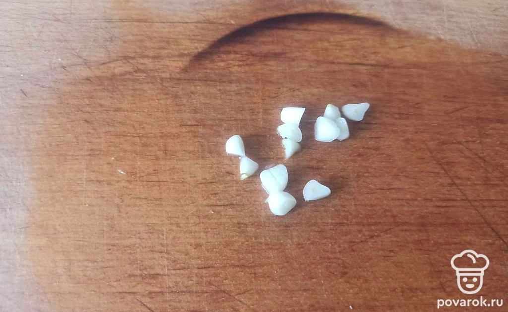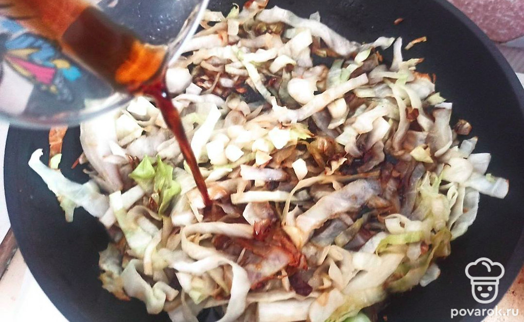 Выложите пшено и чеснок в сковороду. Посолите и полейте соевым соусом. Все перемешайте. Тушите 5 минут и снимите сковороду с плиты.