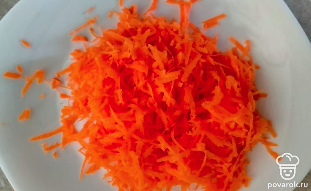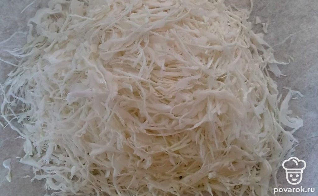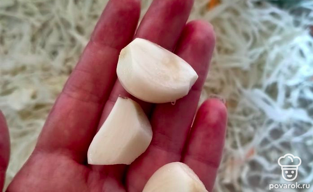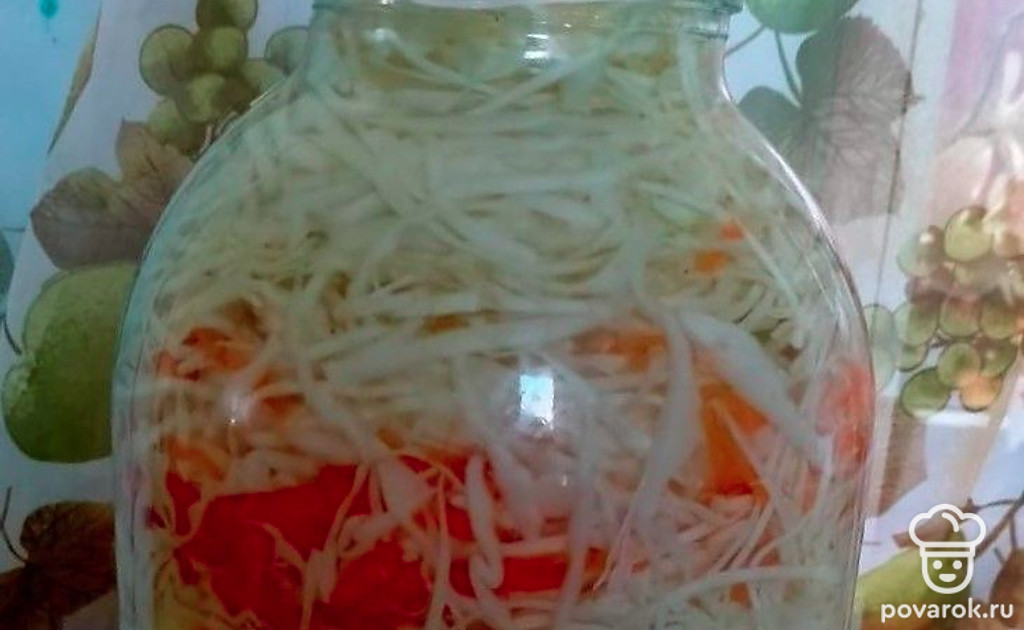 Переложите нарезанную капусту в трехлитровую банку, чередуя ее с нарезанной морковью. В середину положите лавровый лист и чеснок.