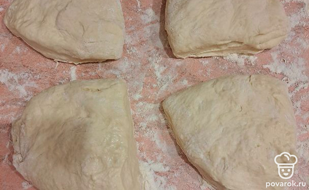 Достаньте тесто из холодильника. Посыпьте стол мукой, разделите тесто на 4 части.