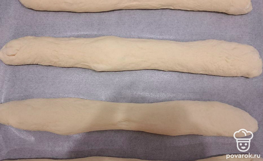 Сформируйте четыре багета, выложите их на противень. Желательно застелить его бумагой для выпечки. Оставьте подниматься на 30 минут.