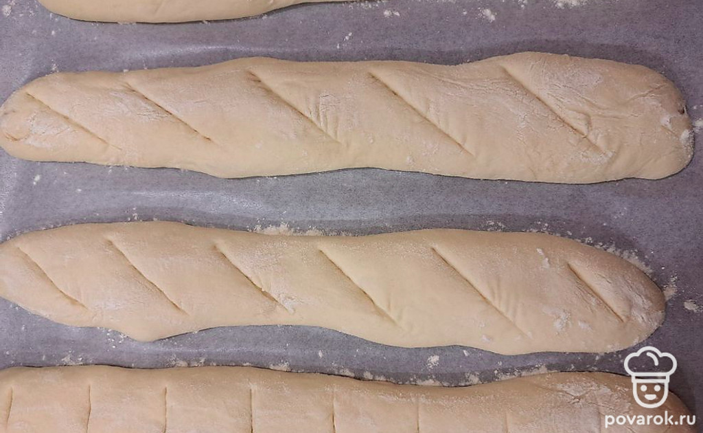 Духовку разогрейте до 220 градусов. На подошедших багетах сделайте надрезы.