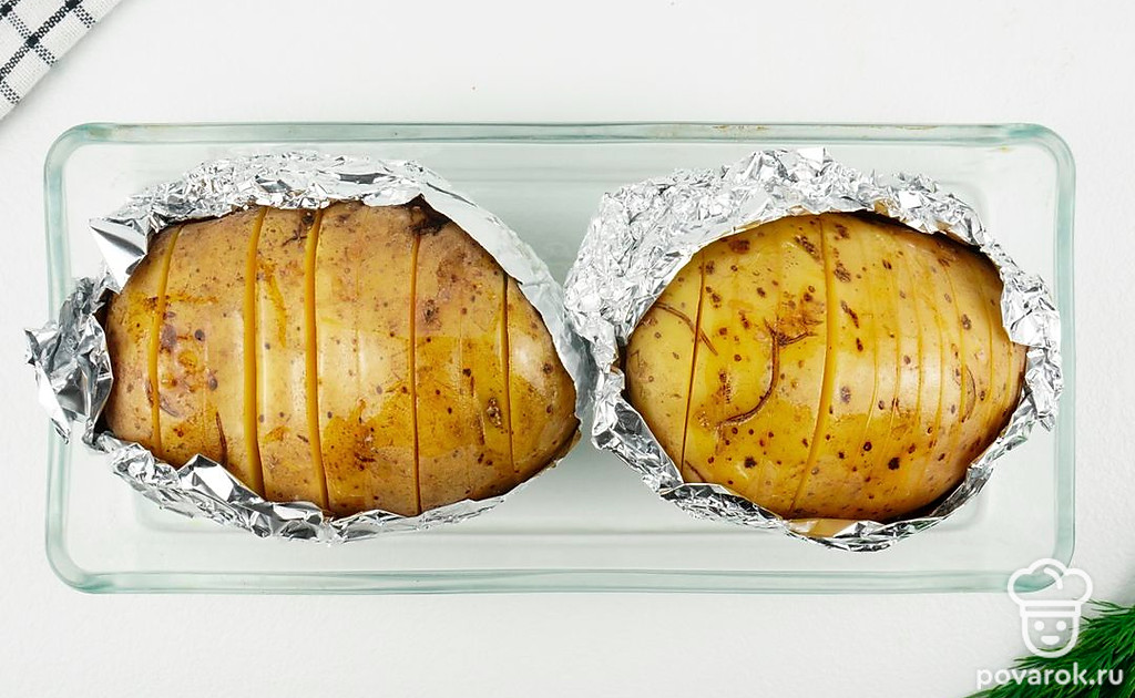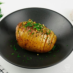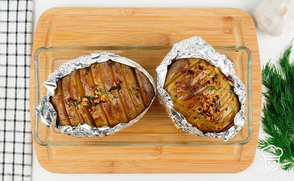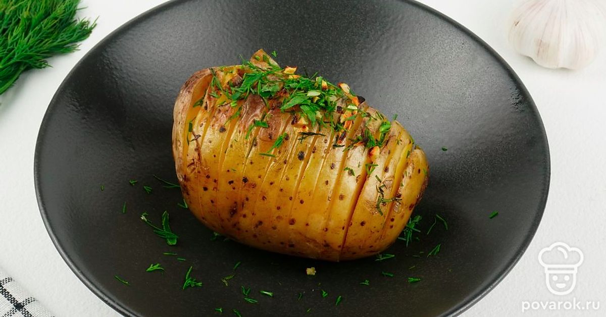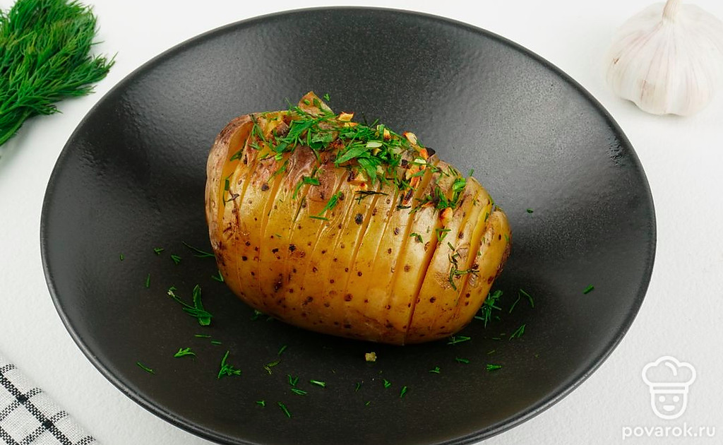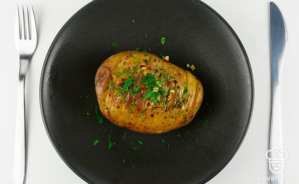 Это блюдо готовится из самых простых и доступных продуктов. С его приготовлением справится даже новичок. Благодаря надрезам, картофель хорошо пропитывается ароматом трав и специй. Кроме того, запеченный картофель с чесноком и зеленью гораздо полезнее жареного. Растительное масло не подвергается жарке, а значит, не выделяет вредных для организма веществ. Картошка-гармошка может стать отличным гарниром или самостоятельным блюдом.