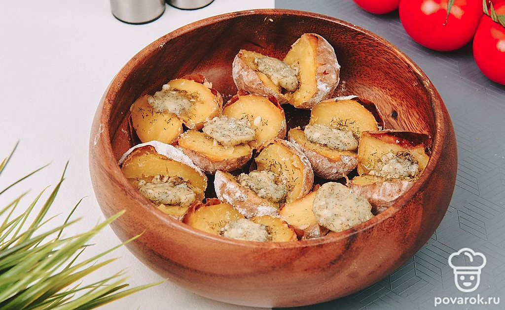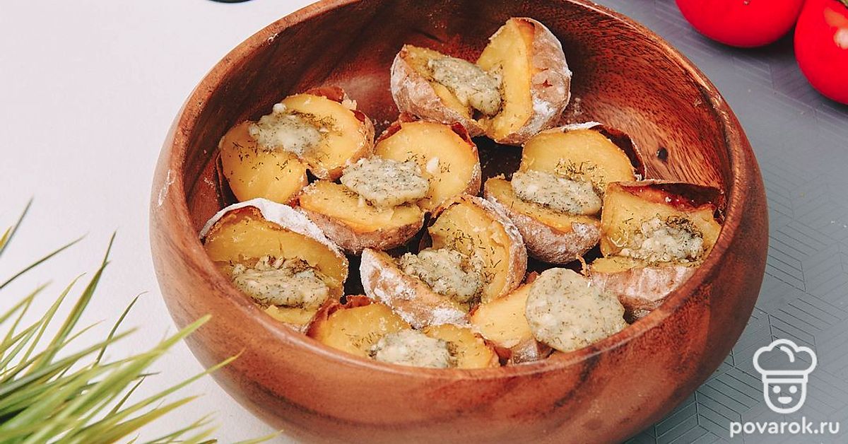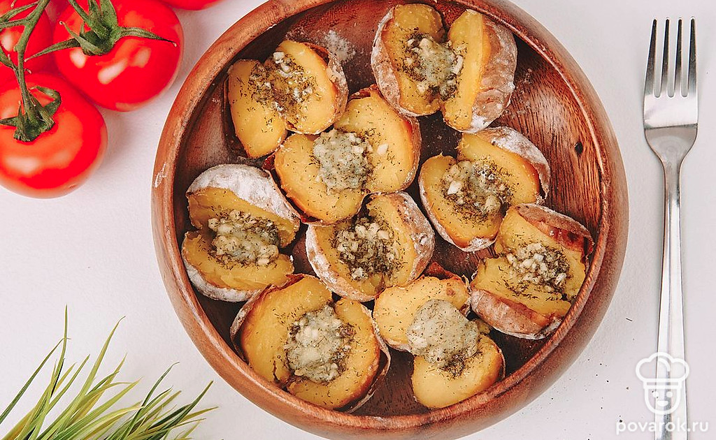 Готовую картошку аккуратно выложите в глубокую тарелку. Разрежьте пополам картофелины и в каждую выложите кусочек масла с чесноком. Приятного аппетита!