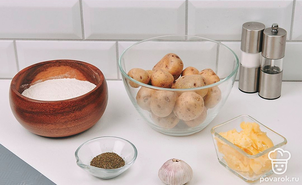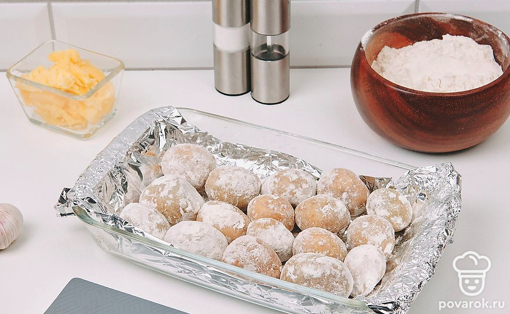 Застелите форму для запекания фольгой. Посыпьте каждую картофелину мукой и выложите в форму. Поставьте форму в разогретую духовку на 50 минут.