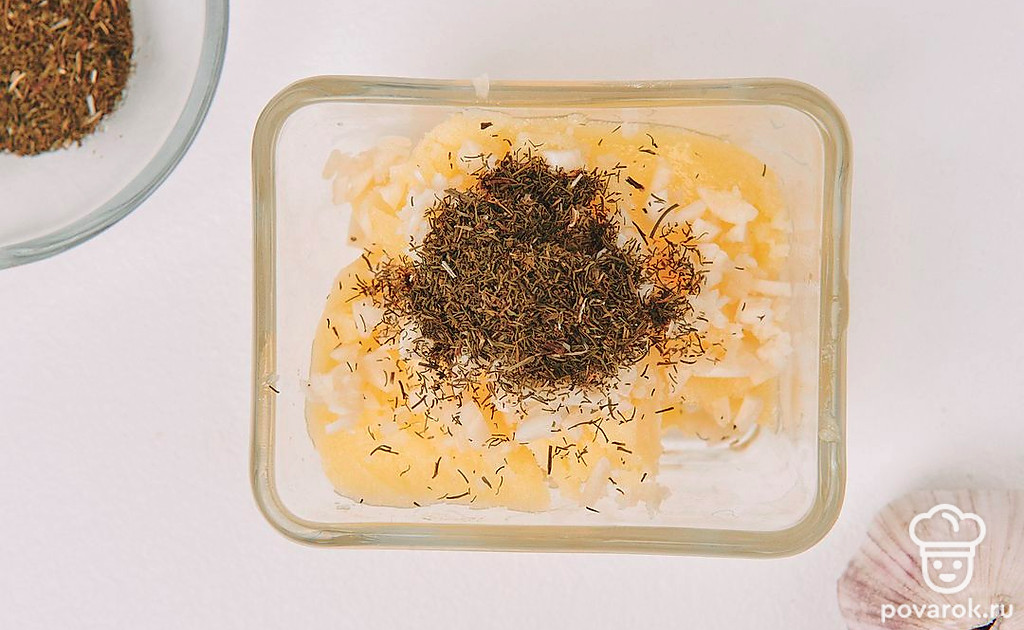 Нарежьте мелко чеснок и смешайте его с мягким сливочным масло и специями.