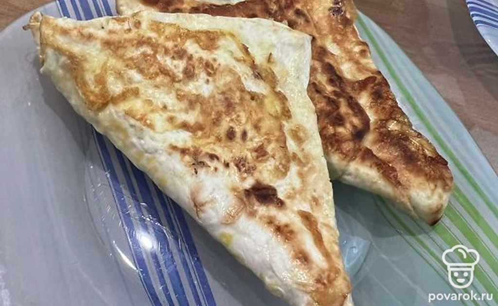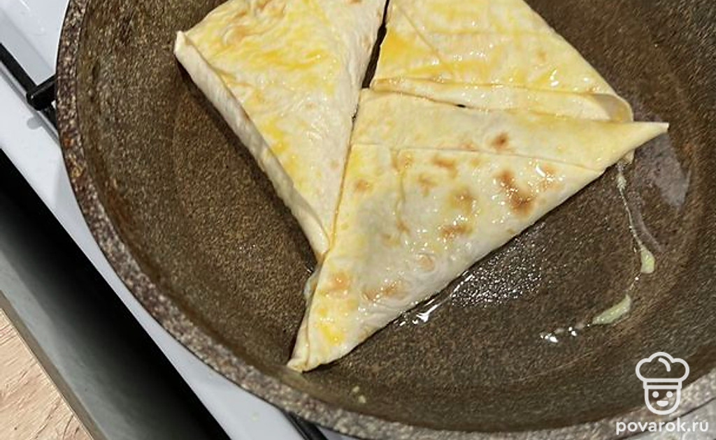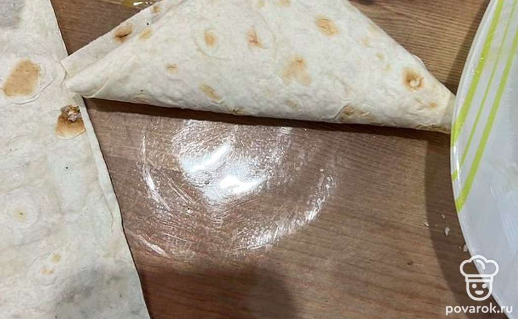 Смесь из колбасы с сыром выложите на край полоски из лаваша, сверните в треугольник-конверт.
