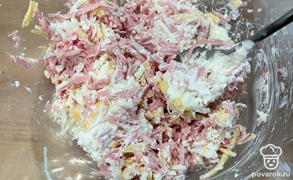 Натрите на крупной терке сыр и колбасу, добавьте сметану. Все перемешайте.