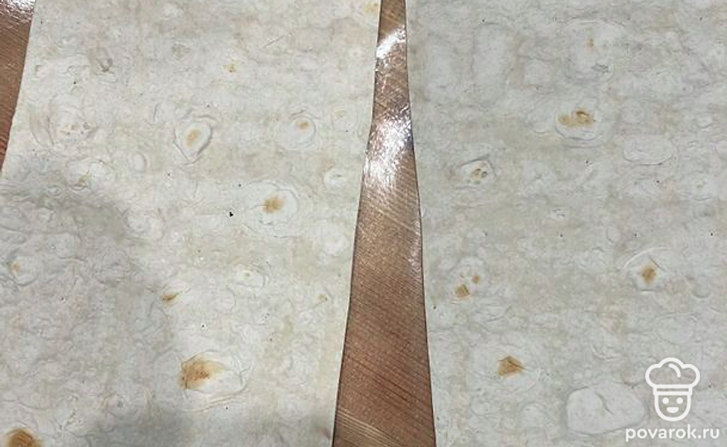 Лаваш разрежьте на ровные полоски шириной примерно 10-12 сантиметров.