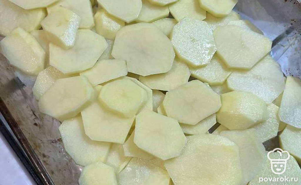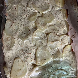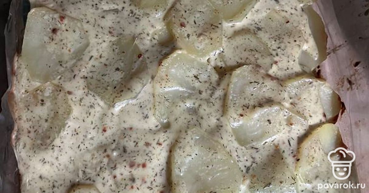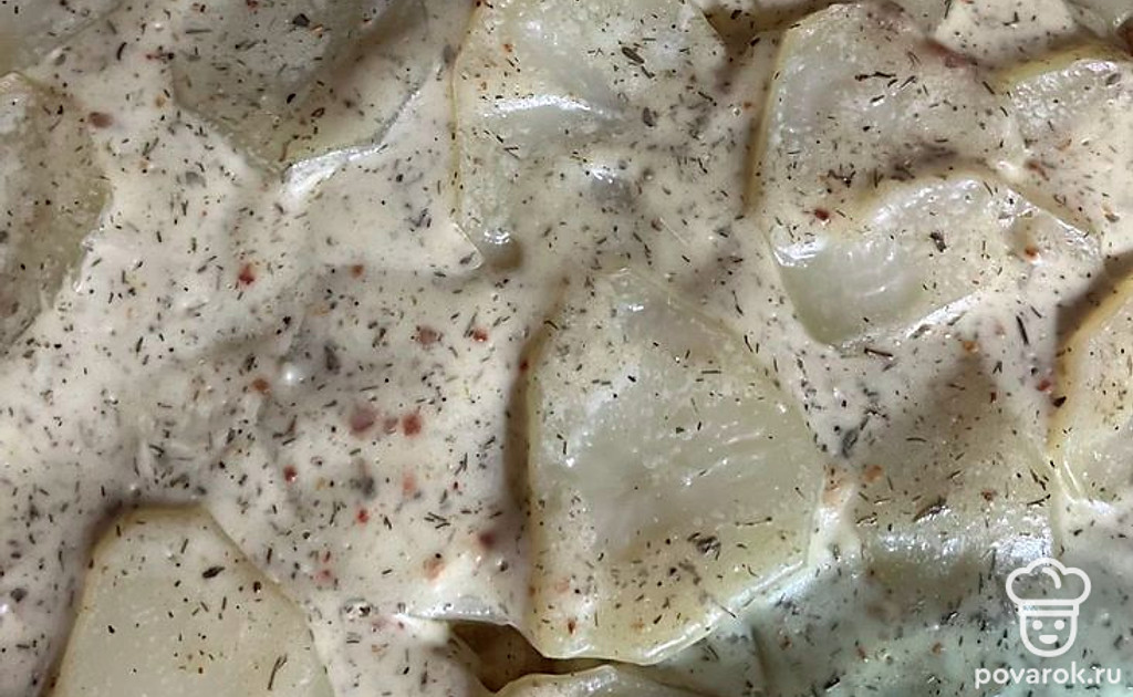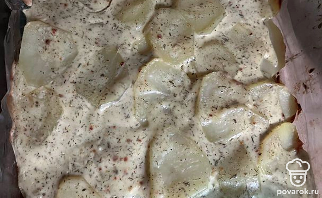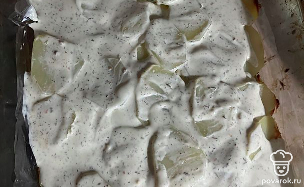 После того, как картофель запекся, достаем его из духовки и заливаем соусом.
