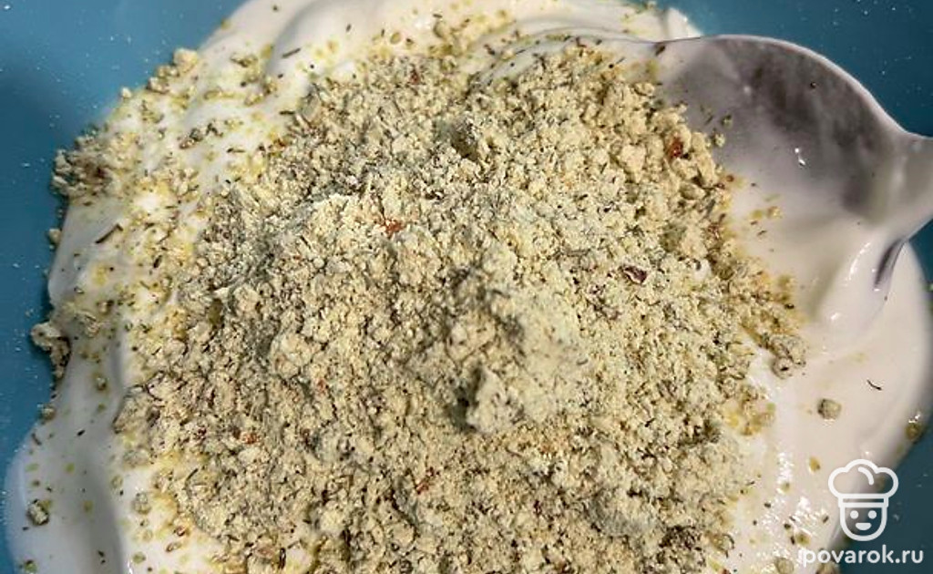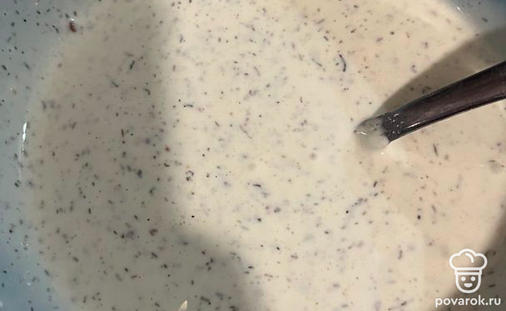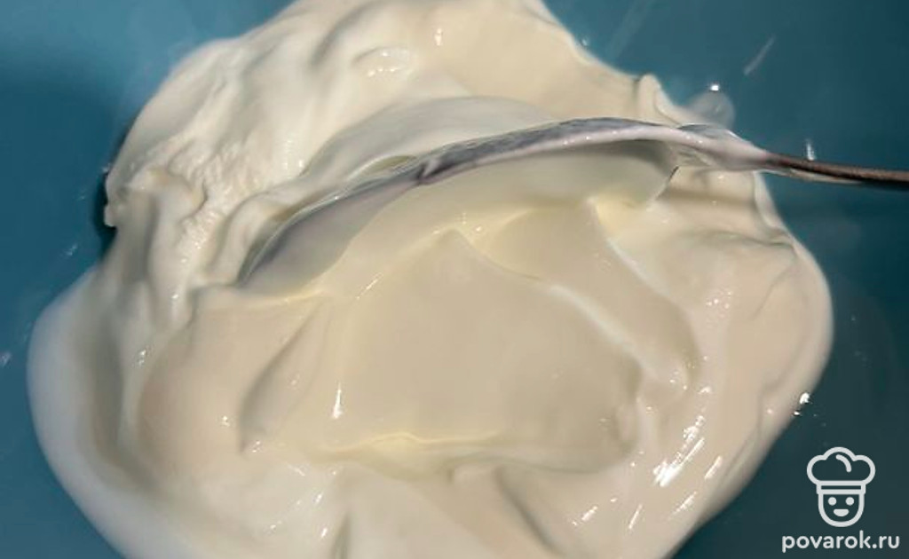 Пока картофель запекается, готовим соус. В тарелку выкладываем сметану.