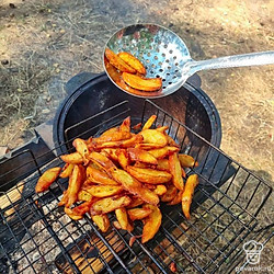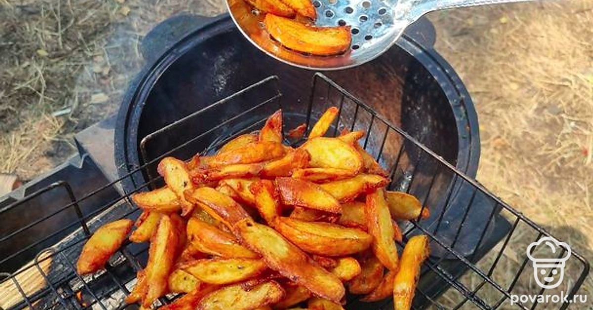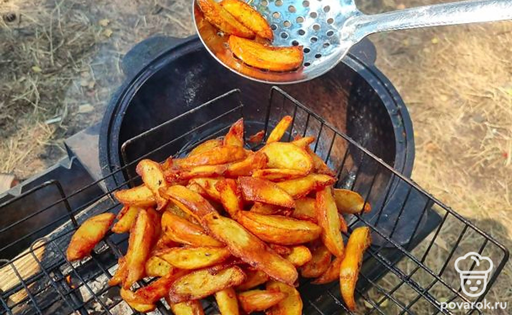 Аккуратно бросаем в кипящее масло картофель и держим до золотистого цвета. Быстро снимаем шумовкой на решетку для гриля в условиях улицы и даем стечь. Если готовите дома — выкладываем на бумажные полотенца или в дуршлаг. Солим и наслаждаемся вкусом.