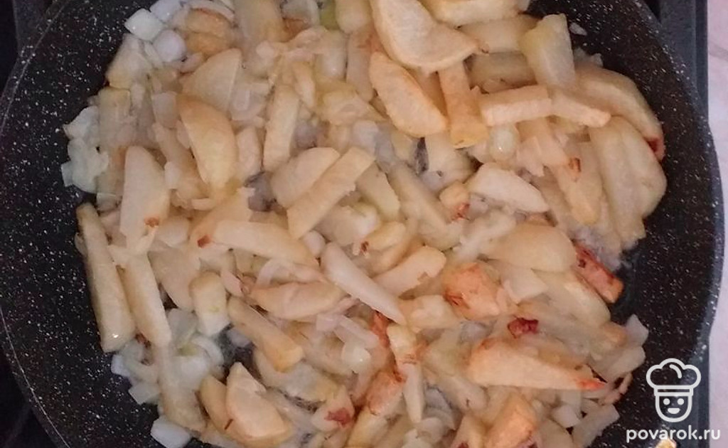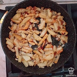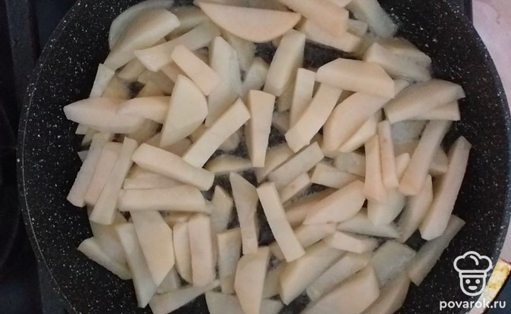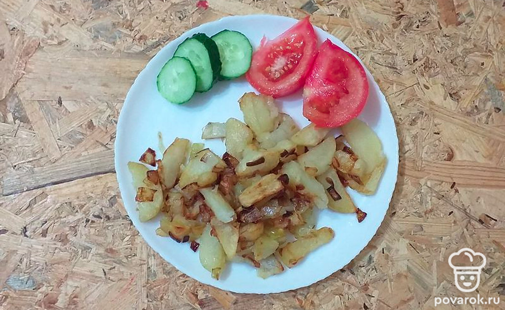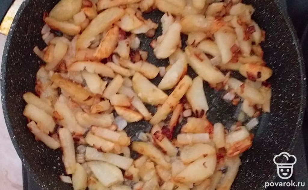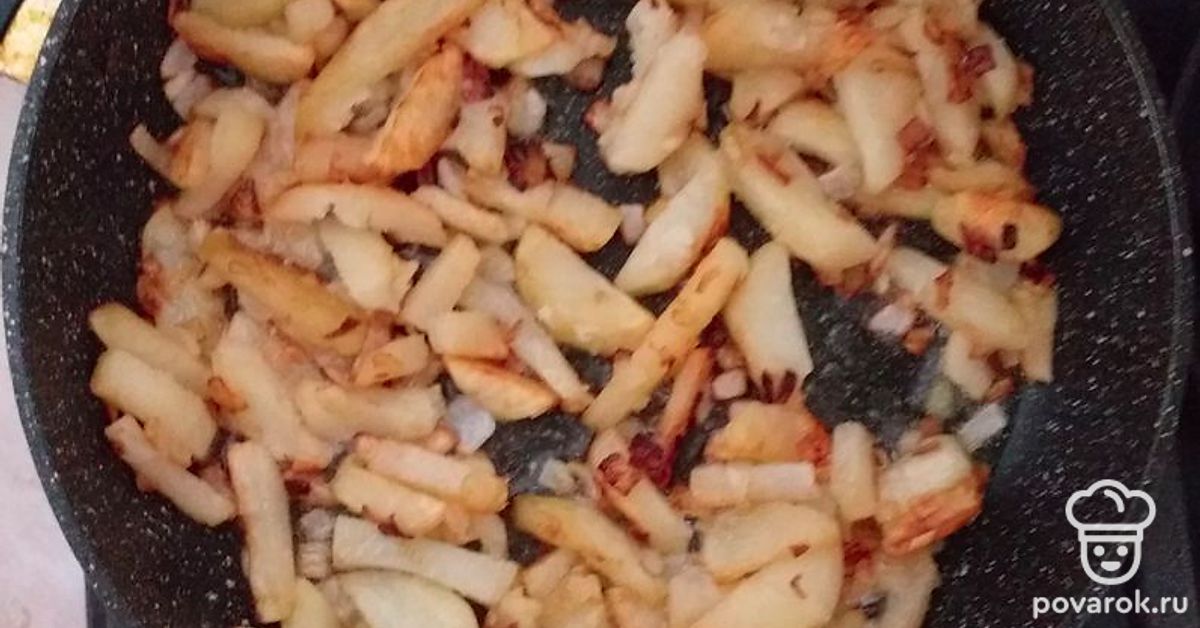 Секрет приготовления этого блюда в том, что картофель жарится в достаточном количестве растительного масла на большом огне. Картошка получается с хрустящей золотистой корочкой.