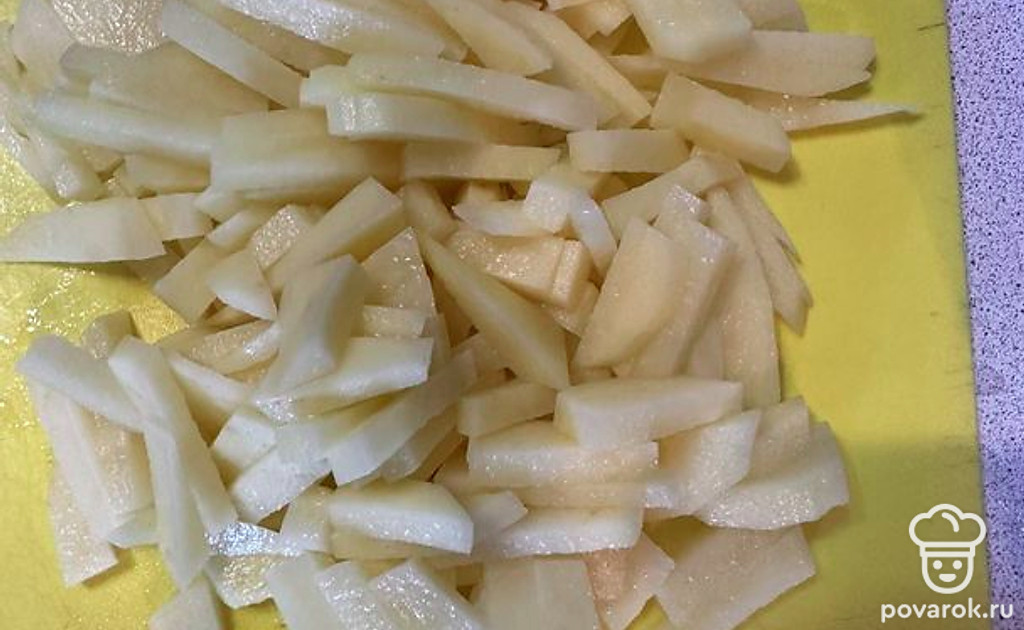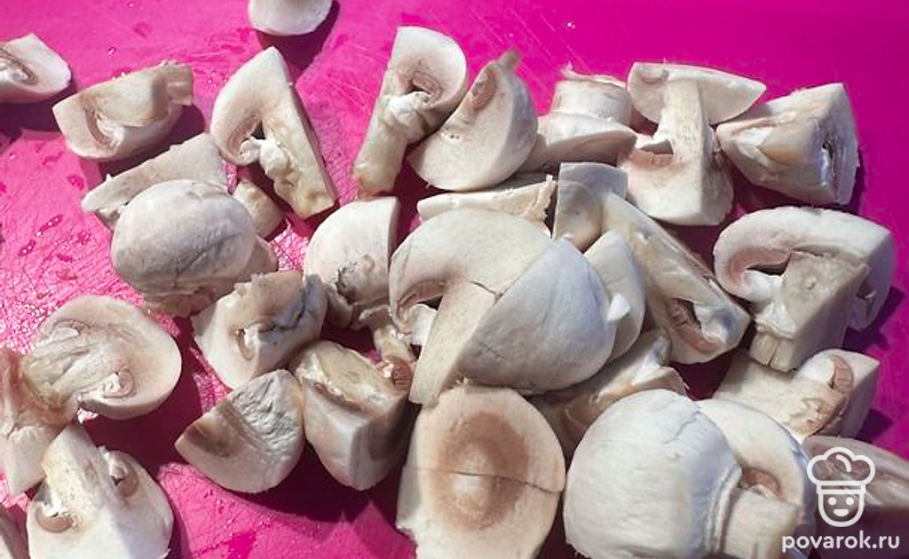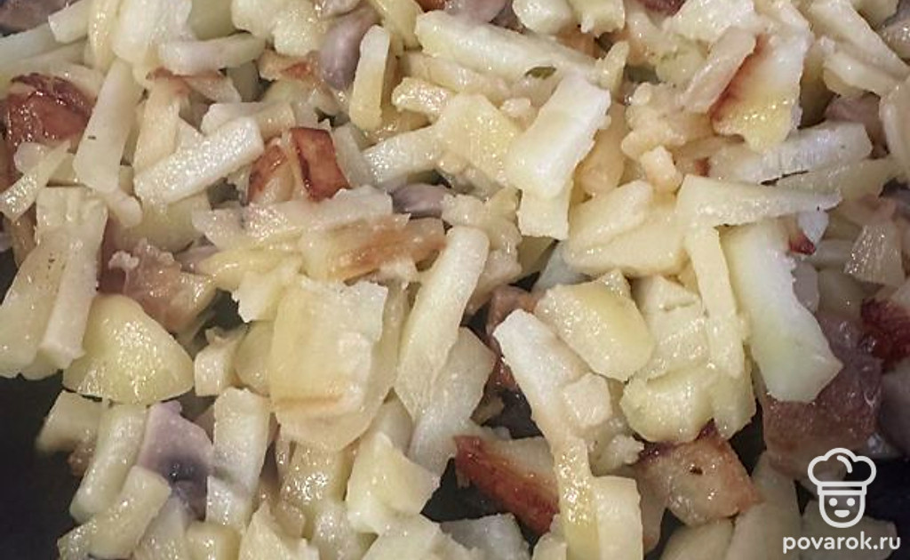 Нарезаем на кусочки. Все выкладываем сковороду, наливаем растительное масло. Жарим.