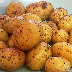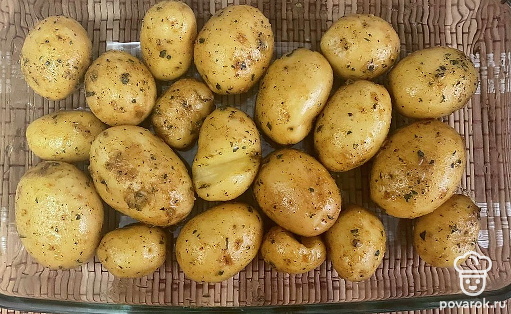 Форму для запекания смажьте маслом, выложите картофель. Запекайте картошку при 190 градусах 35-40 минут.