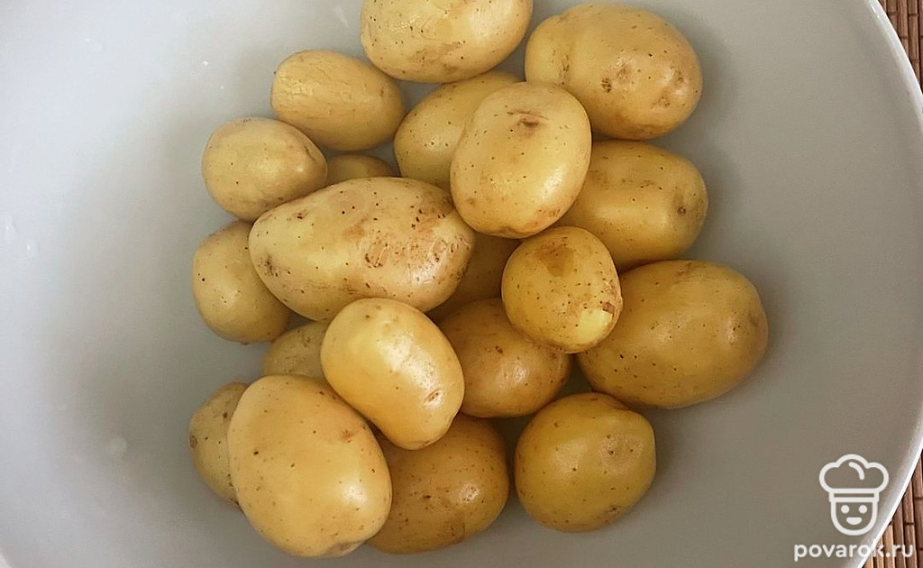 Картошку тщательно помойте, так как запекаться она будет в кожуре. Каждый клубень проткните зубочисткой, чтобы картошка лучше промариновалась.
