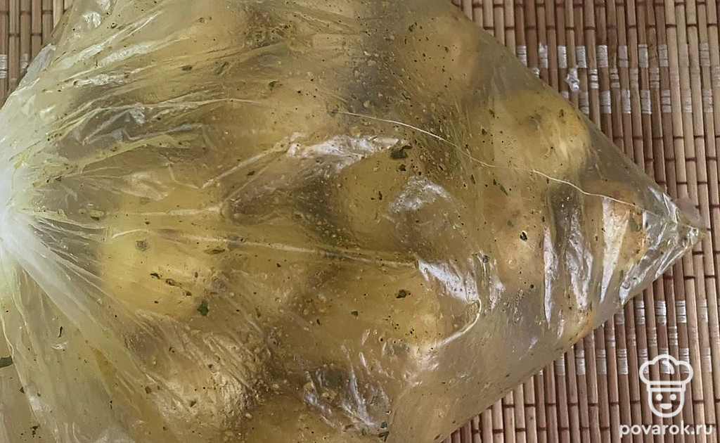 Картофель поместите в пакет, залейте маринадом и оставьте на 20 минут.