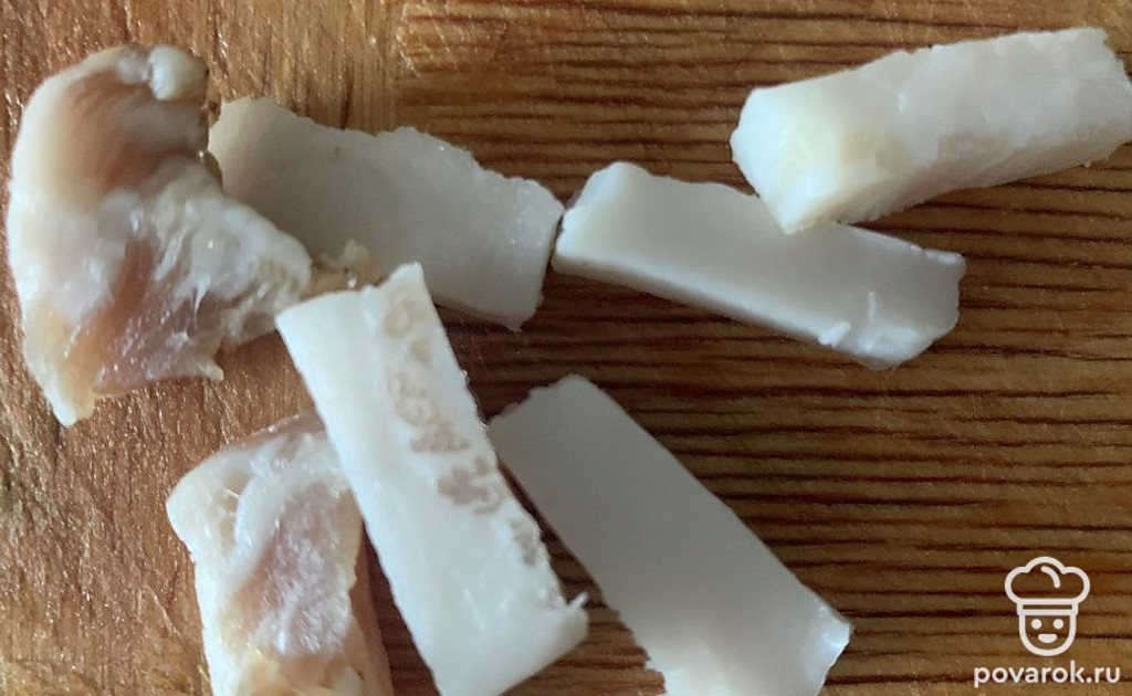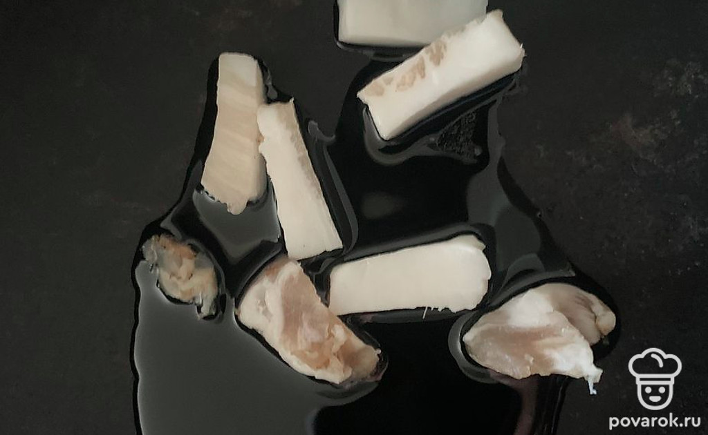 На сковородку налить немного подсолнечного масла и выложить сало.